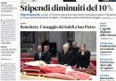 I giornali di oggi si occupano in apertura di notizie diverse: alcuni titolano sull’omaggio in Vaticano alla salma del Papa emerito Benedetto XVI, altri si occupano degli aumenti delle tariffe previsti per il 2023, altri ancora commentano l’azione di alcuni attivisti del movimento Ultima Generazione che ieri mattina hanno lanciato vernice contro la parete esterna del Senato per protestare contro il riscaldamento globale. La Stampa si occupa dei provvedimenti a cui sta lavorando il governo su lavoro e autonomie, Libero titola sulla rivalutazione delle pensioni, e i giornali sportivi si preparano alla ripresa del campionato di calcio di Serie A che riparte domani dopo la pausa per i Mondiali in Qatar.