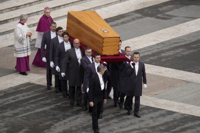 La salma di Benedetto XVI era stata esposta al pubblico da lunedì mattina a mercoledì sera dentro la basilica di San Pietro. Alle 19 di mercoledì la bara era stata chiusa e alle 8:50 di giovedì è stata portata al centro del sagrato di San Pietro, dove in attesa dell’inizio dei funerali è stato recitato il Rosario.