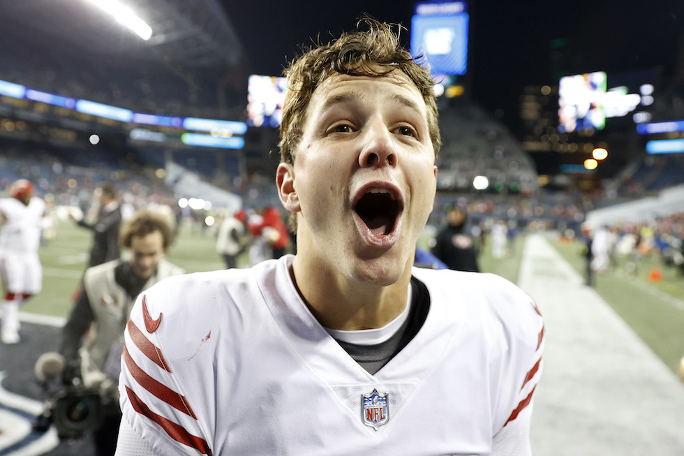 Brock Purdy il 15 dicembre dopo una vittoria a Seattle (Steph Chambers/Getty Images)