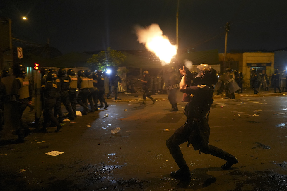 Polizia in tenuta antisommossa durante le proteste a Lima, venerdì 20 gennaio (AP Photo/ Guadalupe Pardo)