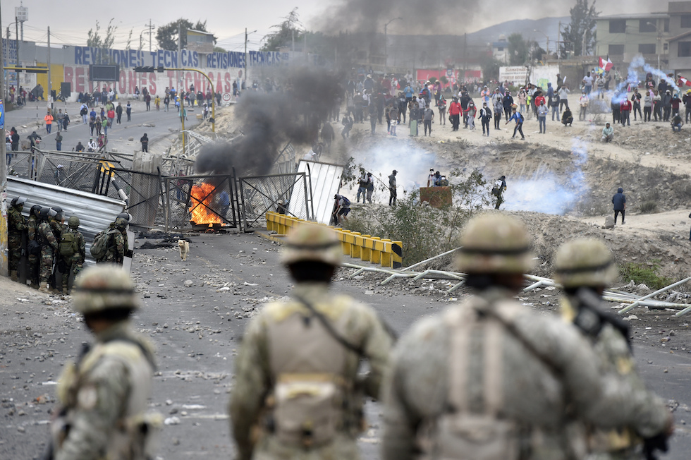 Soldati e manifestanti fuori dall’aeroporto di Arequipa, venerdì 20 gennaio (AP Photo/ Jose Sotomayor)
