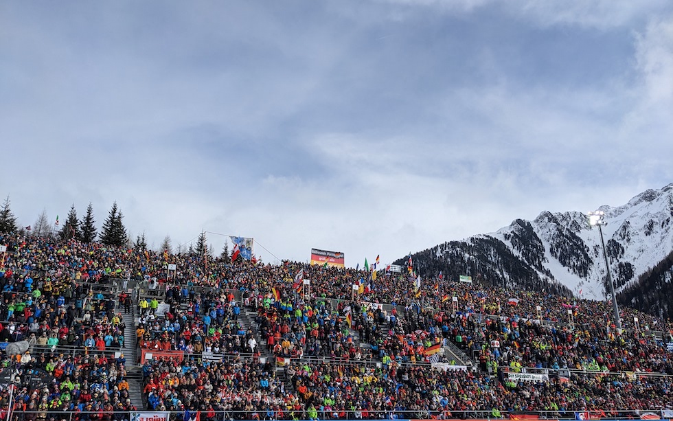 Diversi stadi per il biathlon si sono ampliati e rimodernati negli ultimi anni e nei prossimi, in vista delle Olimpiadi, lo farà anche l’arena di Anterselva. Oltre che sulle tribune quasi sempre gremite e lungo il percorso, durante i weekend di Coppa del Mondo gli spettatori del biathlon hanno l’abitudine di trovarsi in appositi tendoni a mangiare, bere, ballare e cantare. Ad Anterselva, dove il pubblico è tornato quest’anno dopo due anni di restrizioni per la pandemia, il tendone era praticamente pieno anche durante le gare, pur senza maxischermo: «Il trenta per cento di chi viene su nemmeno guarda le gare e sta dentro a fare festa», stima il biatleta italiano Tommaso Giacomel.