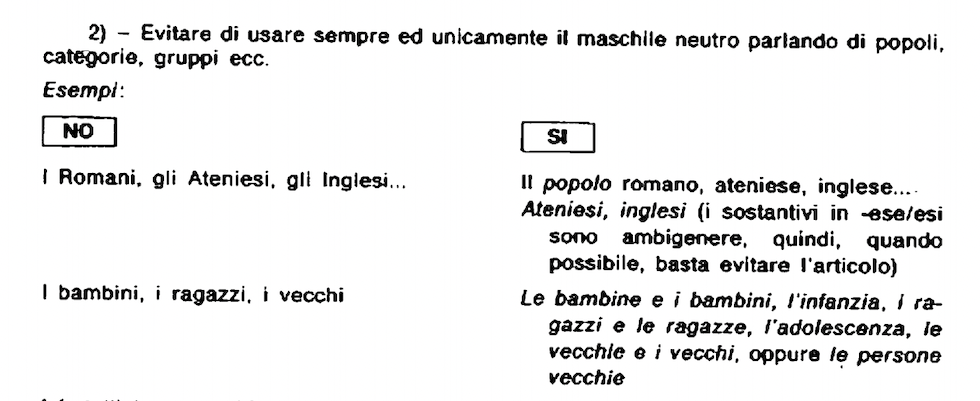 Quest’ultimo consiglio, quello cioè di evitare di usare sempre e unicamente il maschile come neutro parlando di popoli, era già stato dato nel 1987 da Alma Sabatini nelle sue Raccomandazioni per un uso non sessista della lingua italiana, un manuale ancora oggi molto utile e semplice che la linguista aveva scritto per la presidenza del Consiglio dei ministri.