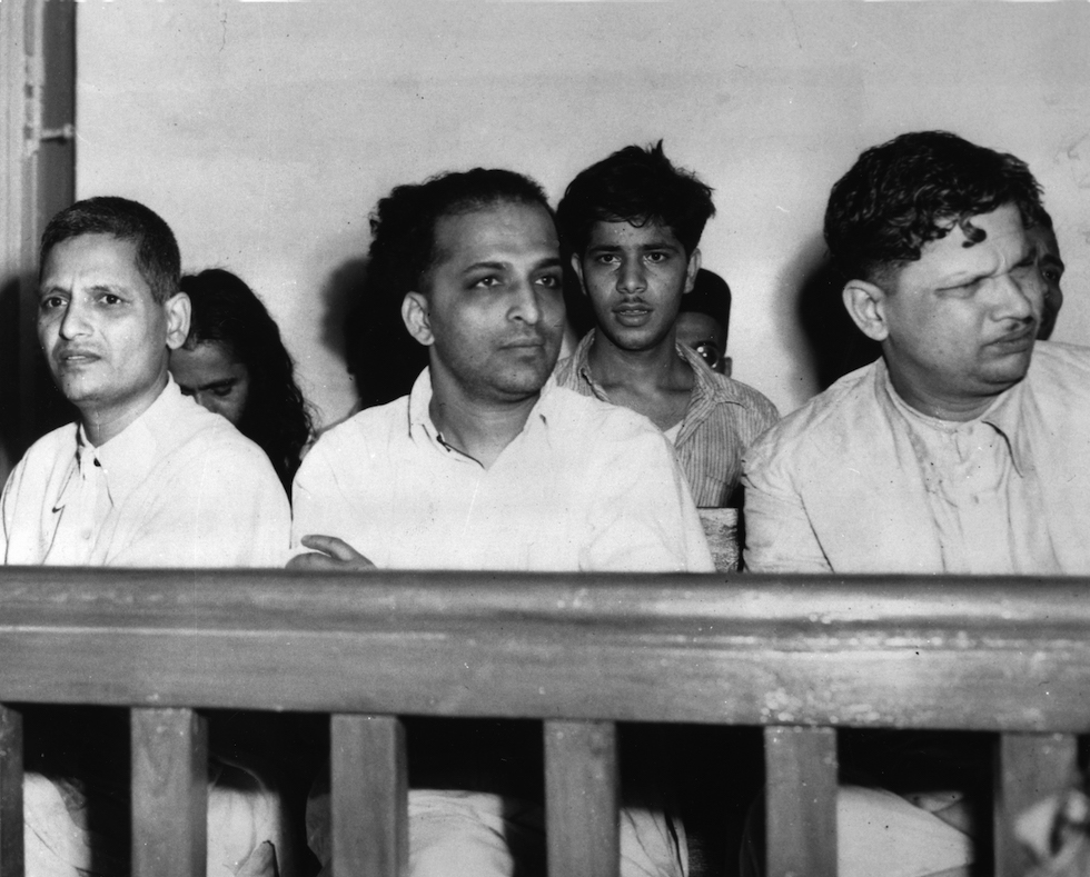 Nathuram Godse, al centro, durante il processo in cui fu accusato dell’omicidio di Gandhi, nel 1948 a Nuova Delhi (AP Photo)
