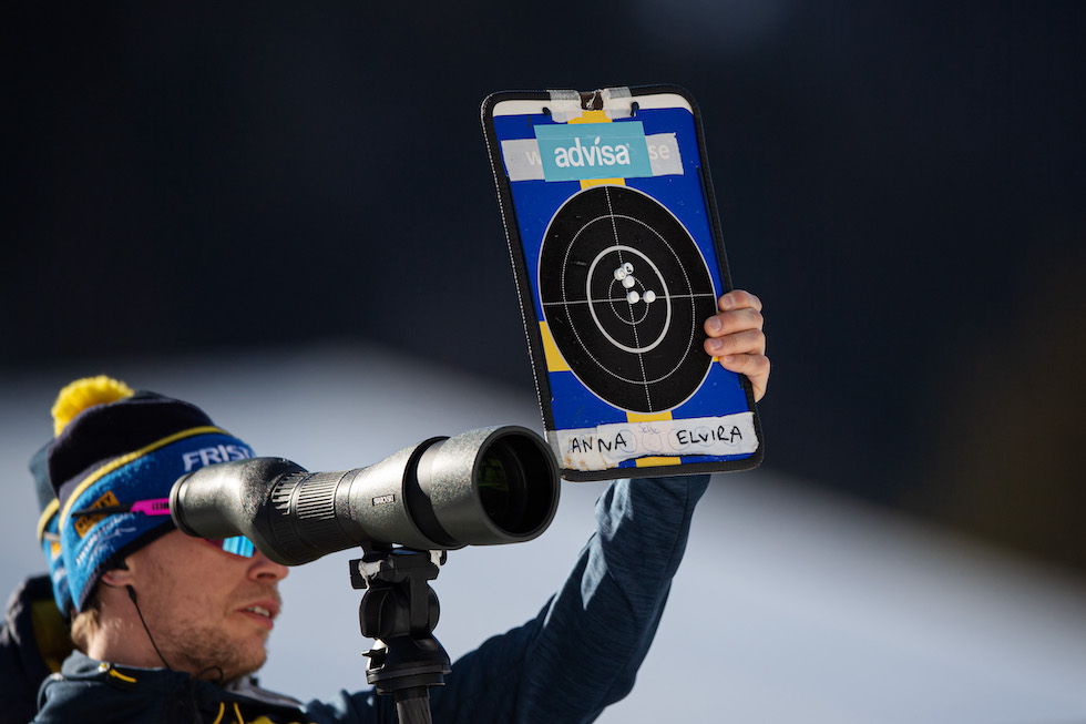 Ai poligoni di tiro, alle spalle dei biatleti ci sono allenatori e allenatrici che osservano i colpi con un cannocchiale per poi comunicare ai biatleti, in vista delle eventuali successive sessioni di tiro, se, come e di quanto devono sistemare i tiri successivi.