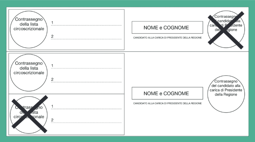 La scheda sarà in entrambi i casi di colore verde e all’interno avrà il nome del candidato o della candidata presidente, con le liste collegate.