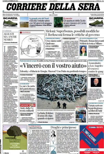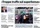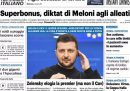 Sono ancora le discussioni sul superbonus edilizio, dopo la decisione del governo di bloccare la cessione dei crediti fiscali e lo sconto in fattura, a occupare l’apertura della maggior parte dei giornali, che titolano sulla possibilità prospettata dalla presidente del Consiglio Meloni di modificare il decreto dopo l’incontro previsto per oggi con le associazioni delle imprese edili e delle banche. Repubblica e il Sole 24 Ore aprono invece sulle parole del presidente ucraino Zelensky, che ha tenuto ieri una conferenza stampa con gli inviati italiani in Ucraina, mentre la Verità critica il divieto di vendita delle auto a benzina e diesel a partire dal 2035 deciso dal Parlamento europeo, e Domani si occupa della candidatura a segretaria del Partito Democratico di Elly Schlein.