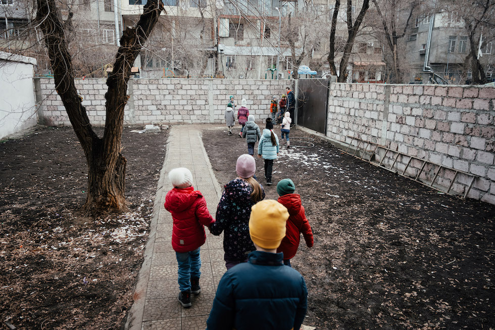 Bambini russi si dirigono verso il parco giochi della “Scuola Libera” durante la ricreazione il 2 febbraio a Yerevan, in Armenia (Tako Robakidze per il Washington Post)