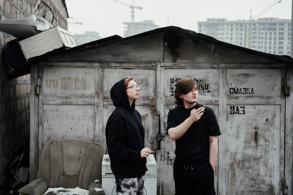 Ekaterina, 19 anni, e Yaroslav, 21 anni, fumano vicino a un rifugio fornito da Kovcheg, un gruppo di sostegno agli immigrati russi, a Yerevan (Tako Robakidze per il Washington Post)