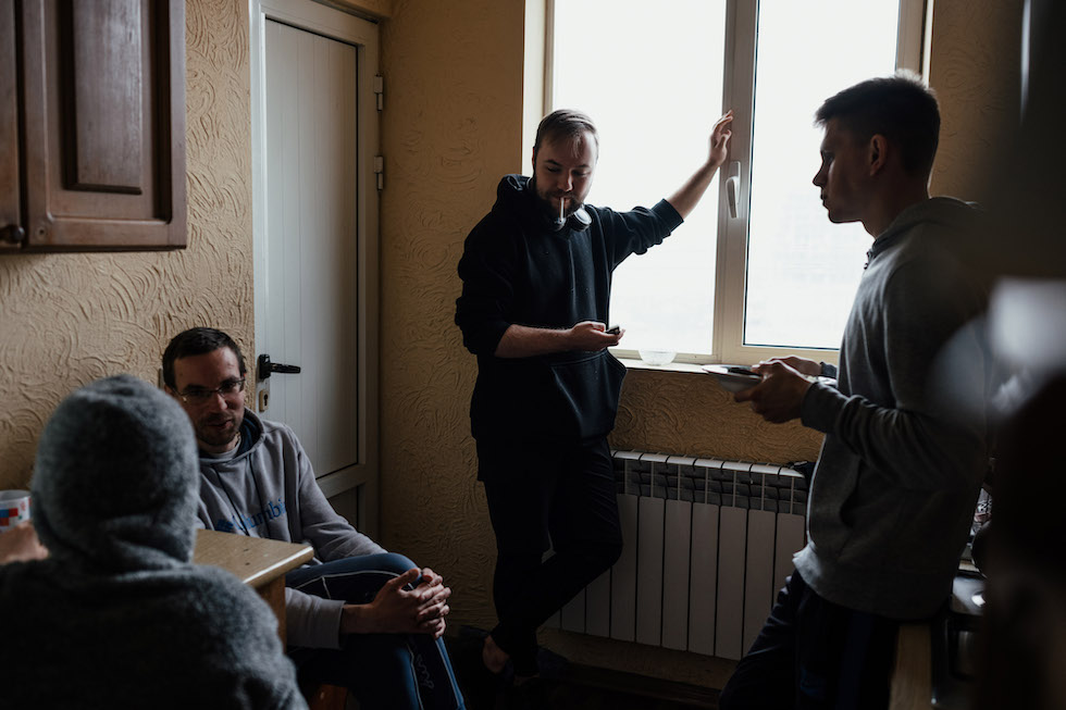 I residenti di un rifugio a Yerevan fornito da Kovcheg, un gruppo di sostegno agli immigrati russi, si riuniscono in cucina (Tako Robakidze per The Washington Post)