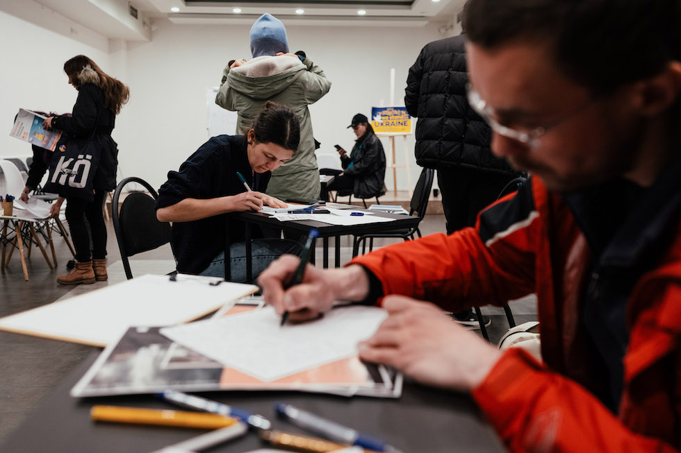 In primo piano, Ivan Lyubimov scrive una lettera a un prigioniero politico in Russia, durante un recente evento organizzato da Kovcheg (Tako Robakidze per il Washington Post)