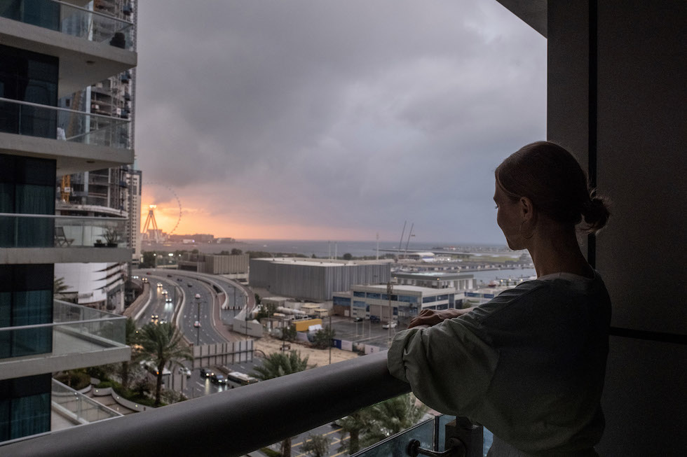 Anastasia Smernova, fitness trainer e influencer russa, sul suo balcone il mese scorso in uno spazio di coabitazione a Dubai occupato principalmente da russi di classe media (Natalie Naccache per il Washington Post)