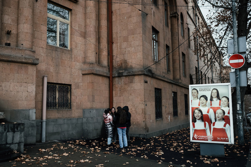 Alcune ragazze parlano davanti alla scuola di musica Sayat-Nova di Yerevan, il 2 febbraio (Tako Robakidze per il Washington Post)
