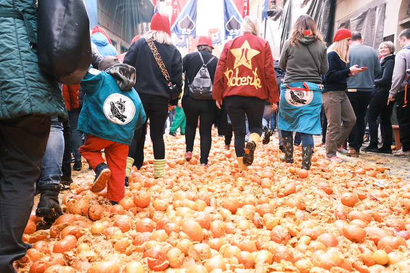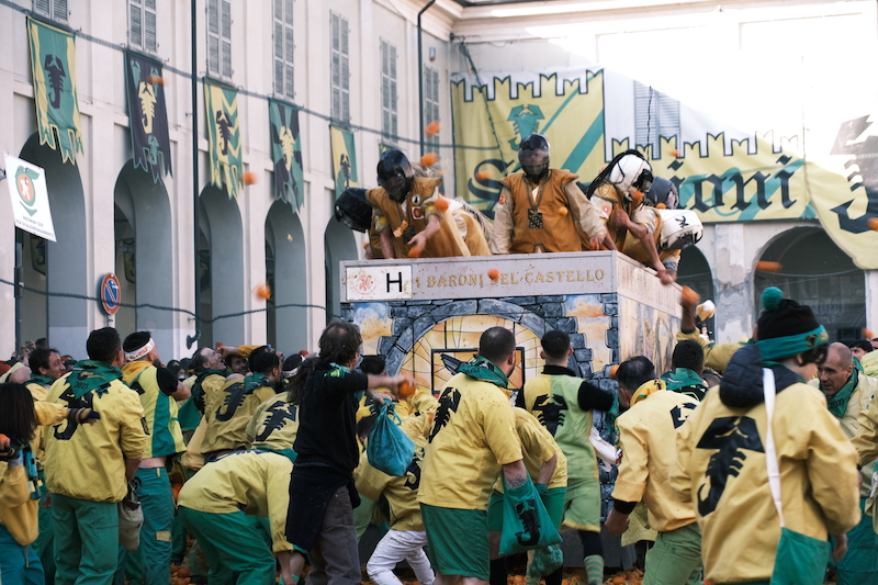 Per tre giorni, dalla domenica al martedì grasso, nelle strade e nelle piazze di Ivrea si sfidano 8mila “aranceri” a piedi, che rappresentano il popolo in rivolta, e altri duemila su 54 carri trainati da cavalli, a simboleggiare la nobiltà e il potere. Gli aranceri sono divisi in nove squadre, ognuna con un simbolo, e nei giorni della battaglia si scagliano violentemente addosso enormi quantità di arance: alla fine una commissione apposita premia la squadra che ha avuto la mira migliore e si è distinta maggiormente nello scontro.