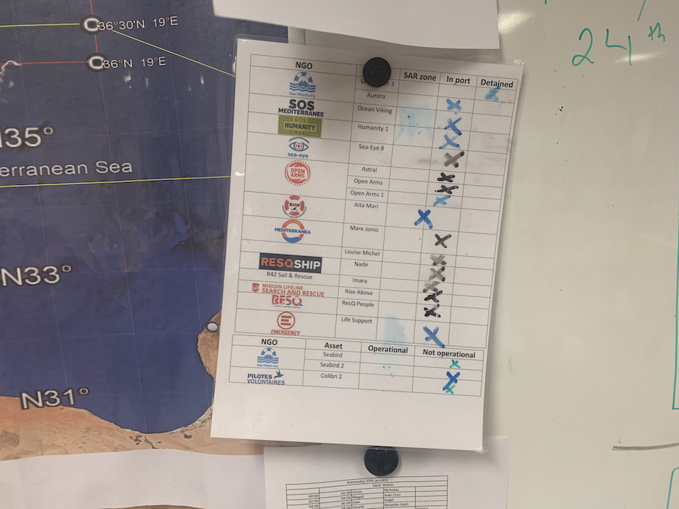 Molti membri della Geo Barents sanno bene che l’assenza della nave significa che al momento nel Mediterraneo centrale non c’è nessuno a soccorrere eventuali migranti in difficoltà. Nella fascia di mare dove avviene la maggior parte delle operazioni di soccorso non sta operando nessuna nave delle ong, come mostra anche un foglio appeso negli uffici di Medici Senza Frontiere sulla Geo Barents.