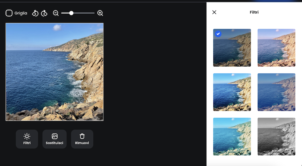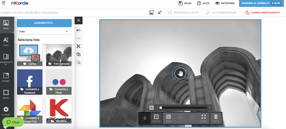 Una volta caricata la foto, c’è la possibilità di fare al progetto modifiche di diverso tipo: si possono inserire testi, filtri ed elementi grafici, ad esempio, o cambiare il colore degli sfondi. Si può vedere in anteprima l’effetto finale, cosa che abbiamo particolarmente apprezzato.