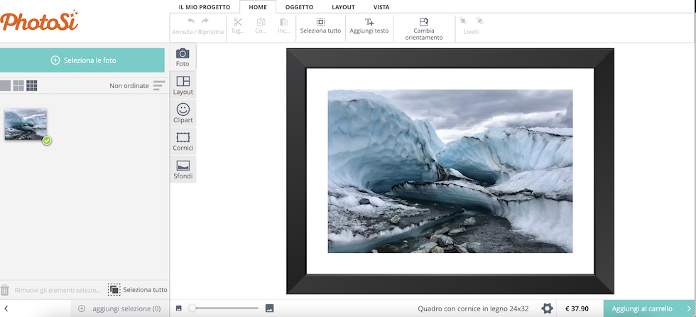 Anche in questo caso ci sono opzioni di modifica relative a scelte grafiche, numero di foto da inserire, utilizzo del passepartout, aggiunta di testi o altri elementi. Anche in questo caso, però, ci siamo limitati all’opzione con passepartout senza ulteriori modifiche. Il quadro con cornice è costato 37,90 euro e a differenza di tutti gli altri prodotti è l’unico a non avere un vetro o una protezione davanti alla stampa: la carta si può toccare direttamente.
