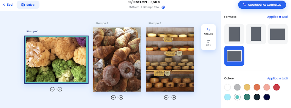 Anche in questo caso il procedimento è simile a quelli che abbiamo già descritto, ed è molto semplice. Per scegliere le stampe classiche rettangolari ci sono solo tre formati (20×30; 11×15; 15×20): abbiamo scelto 11×15, ma ci è sembrato strano mancasse quello standard 10×15. Per la stampa si può scegliere tra carta lucida e opaca. Rispetto ai servizi di cui abbiamo parlato finora, c’è un’opzione in più: si può decidere se lasciare una cornice bianca o colorata attorno all’immagine o se stamparla a piena pagina, come si vede nelle immagini qui sotto. La stampa di dieci foto è costata 3,50 euro.