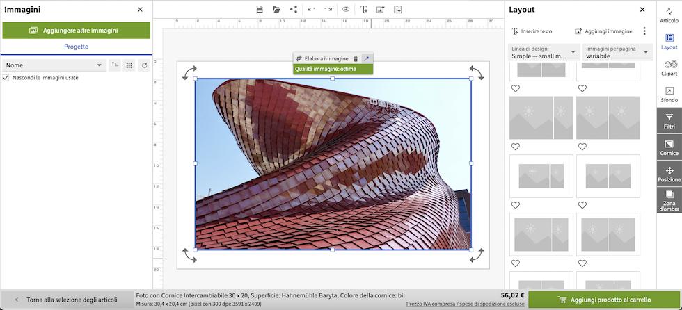 Per il quadro da 20×30 centimetri, invece, il prezzo era 56,02 euro, molto maggiore rispetto al prezzo offerto dagli altri servizi per lo stesso prodotto. A incidere sul prezzo, però, sono il tipo di cornice, diversa da tutte le altre, e il tipo di carta. La cornice è in alluminio, smontabile tramite viti qualora si volesse cambiare la foto al suo interno, e ha una robustezza innegabile. Oltre al colore – bianco, nero, argento e grigio antracite – si può scegliere anche lo spessore. Noi abbiamo scelto quella bianca, spessa 38 millimetri, che costava uguale a quella da 14 millimetri.