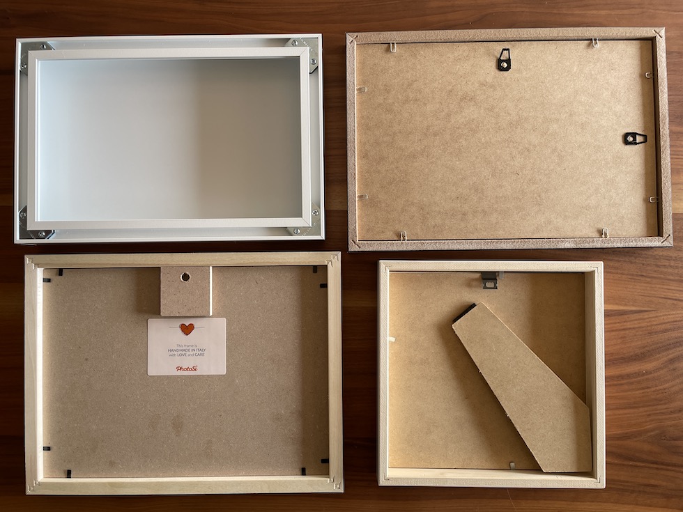 La differenza tra il retro della cornice di Saal e le altre. In ordine dall’alto a sinistra: Saal, Rikorda, PhotoSì, Cheerz