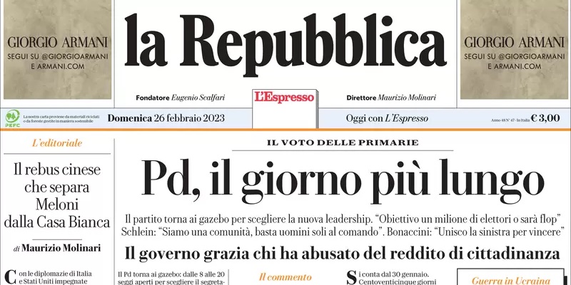 Ci sono cose diverse sulle prime pagine dei giornali di oggi: Repubblica apre sulle elezioni primarie per eleggere il nuovo segretario del Partito Democratico (PD), previste per oggi tra i due candidati Stefano Bonaccini ed Elly Schlein, mentre il Corriere della sera e La Stampa hanno dedicato la loro apertura alle discussioni nel governo sulle concessioni balneari. Sul tema, venerdì il presidente della Repubblica Sergio Mattarella aveva espresso riserve firmando la conversione in legge del decreto “Milleproroghe”, il provvedimento che il governo usa quasi ogni anno per prorogare norme in scadenza e di cui il parlamento non è riuscito a occuparsi. Un’altra notizia piuttosto presente sono le tensioni e le proteste dovute al respingimento, da parte della Corte di Cassazione, del ricorso del detenuto anarchico Alfredo Cospito contro il regime detentivo del 41-bis a cui è sottoposto, e contro cui sta conducendo uno sciopero della fame da oltre 4 mesi.