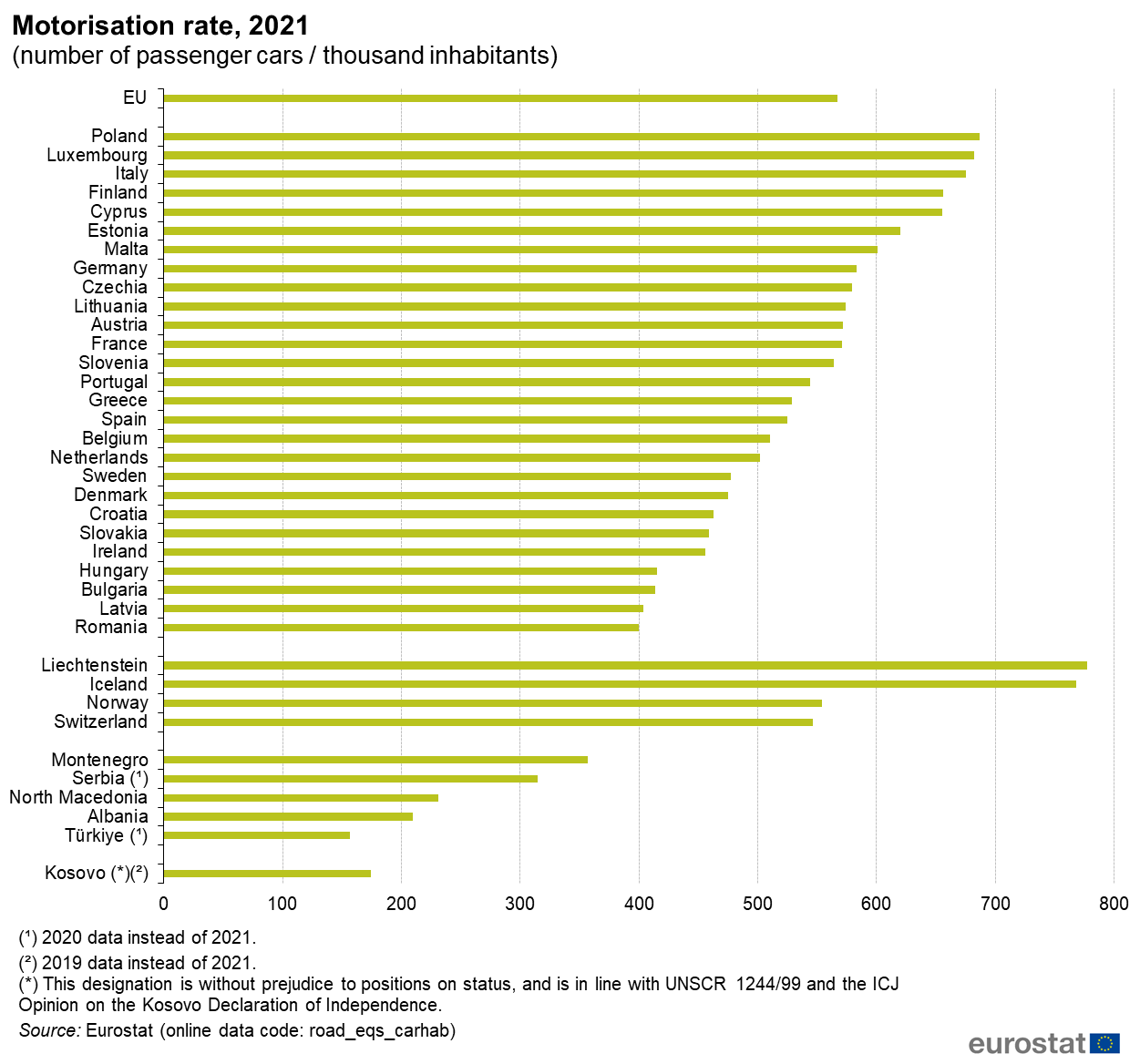 Tutto ciò è avvenuto in una fase storica in cui non ci sono mai state così tante automobili in Europa. Eurostat, l’ufficio statistico dell’Unione Europea, segnala che sono in circolazione 250 milioni di automobili. La quantità di auto elettriche è ancora bassa, secondo i dati riferiti al 2021 ci sono poco meno di 2 milioni di veicoli di questo tipo: è comunque un aumento di 37 volte rispetto a dieci anni fa. In termini assoluti, l’Italia è il secondo paese dell’Unione Europea per numero di automobili (40 milioni) dopo la Germania (49 milioni). Il nostro paese è anche tra i più “motorizzati”: con 675 automobili ogni mille persone è al terzo posto, preceduto da Polonia e Lussemburgo.