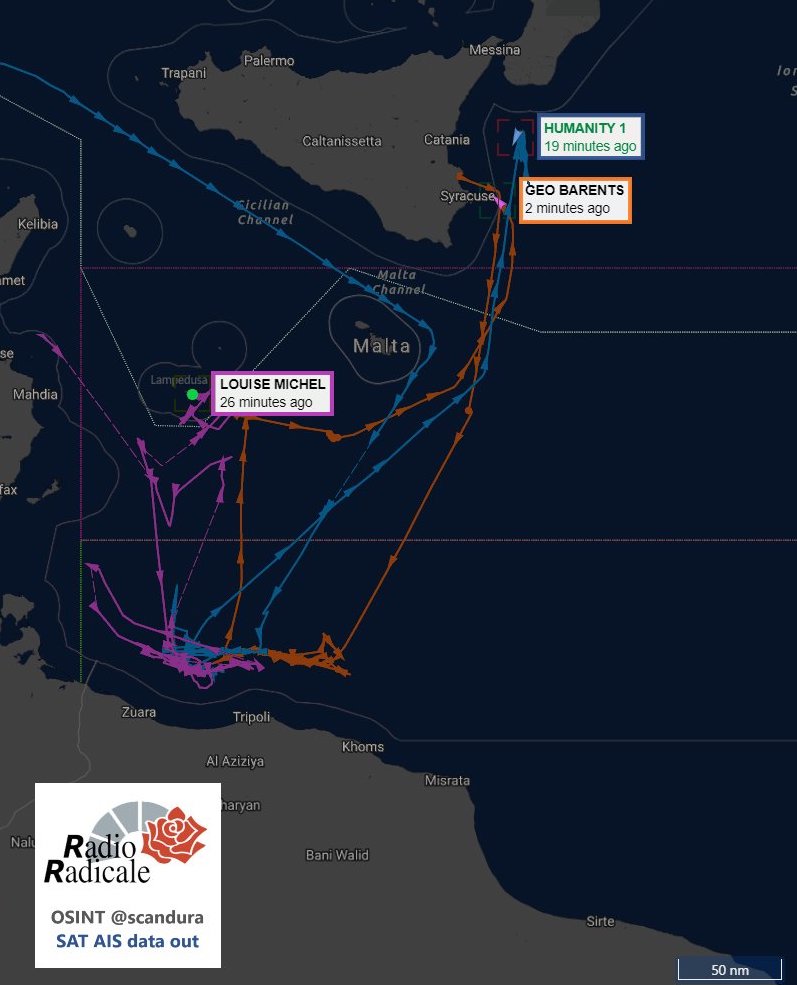 Le operazioni compiute a dicembre 2022 da tre navi delle ong, la Humanity 1, la Louise Michel e la Geo Barents, in un grafico diffuso da Sergio Scandura di Radio Radicale