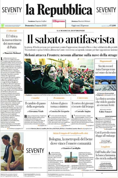 Sulla gran parte delle prime pagine dei giornali di oggi ci sono soprattutto le dichiarazioni della presidente del Consiglio Giorgia Meloni sul naufragio in Calabria e la grande manifestazione antifascista di sabato a Firenze. Meloni ha sostenuto che il governo italiano non avesse ricevuto «indicazioni di emergenza da Frontex», l’agenzia dell’Unione Europea che svolge le funzioni di guardia di frontiera e costiera; alla manifestazione di Firenze invece si è vista per la prima volta Elly Schlein in qualità di nuova segretaria del PD. I quotidiani sportivi dedicano un po’ di spazio all’oro e all’argento vinti rispettivamente da Samuele Ceccarelli e Marcell Jacobs agli Europei indoor di atletica leggera.