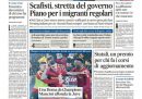 La maggior parte dei giornali di oggi dedica l’apertura alla gestione degli arrivi dei migranti in Italia, con ipotesi su provvedimenti a cui starebbe lavorando il governo per accoglierne regolarmente una quota e per prevedere pene più severe per gli scafisti, e al naufragio di domenica scorsa sulla costa calabrese ionica, con le indagini sui mancati soccorsi, le parole del Papa durante l’Angelus e la cerimonia sulla spiaggia di Cutro. Il Corriere della Sera e la Verità aprono invece sull’inchiesta della procura di Bergamo sulla pandemia, il Giornale titola sulle violenze durante la manifestazione anarchica di sabato a Torino, e i giornali sportivi commentano i risultati della domenica in Serie A, con le vittorie della Roma sulla Juventus e dell’Inter sul Lecce.