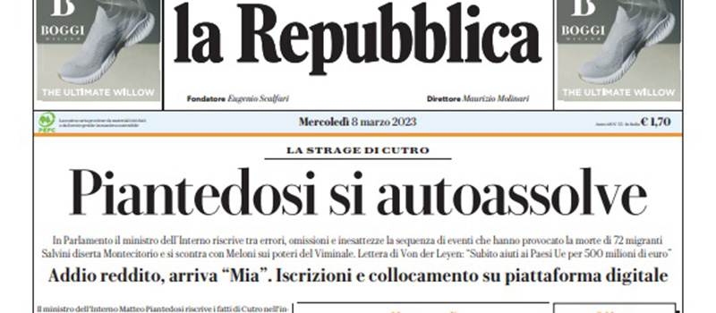 La notizia principale su cui aprono quasi tutti i giornali di oggi è l’informativa al parlamento del ministro dell’Interno Piantedosi sul naufragio di dieci giorni fa di un imbarcazione di migranti davanti alla costa calabrese ionica; Piantedosi ha ricostruito gli avvenimenti di quella notte giustificando i comportamenti di governo, guardia di finanza e guardia costiera, ma lasciando molti dubbi sul mancato soccorso all’imbarcazione. Qualche giornale dedica invece l’apertura alla giornata internazionale della donna che si celebra oggi, il Fatto critica la proposta di riforma del fisco a cui sta lavorando il governo, la Verità continua la sua campagna contro le restrizioni decise durante la pandemia cercando fra i documenti dell’inchiesta della procura di Bergamo, e i giornali sportivi presentano la partita di stasera fra Milan e Tottenham che deciderà chi si qualifica ai quarti di finale di Champions League.