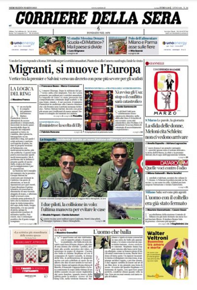 La notizia principale su cui aprono quasi tutti i giornali di oggi è l’informativa al parlamento del ministro dell’Interno Piantedosi sul naufragio di dieci giorni fa di un imbarcazione di migranti davanti alla costa calabrese ionica; Piantedosi ha ricostruito gli avvenimenti di quella notte giustificando i comportamenti di governo, guardia di finanza e guardia costiera, ma lasciando molti dubbi sul mancato soccorso all’imbarcazione. Qualche giornale dedica invece l’apertura alla giornata internazionale della donna che si celebra oggi, il Fatto critica la proposta di riforma del fisco a cui sta lavorando il governo, la Verità continua la sua campagna contro le restrizioni decise durante la pandemia cercando fra i documenti dell’inchiesta della procura di Bergamo, e i giornali sportivi presentano la partita di stasera fra Milan e Tottenham che deciderà chi si qualifica ai quarti di finale di Champions League.