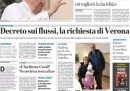 I giornali di oggi si occupano in apertura del Consiglio dei ministri tenuto ieri a Cutro, in Calabria, dove quasi due settimane fa sono morte più di settanta persone nel naufragio di un’imbarcazione di migranti: il decreto approvato dal governo per contrastare l’immigrazione irregolare e agevolare il flusso di migranti regolari prevede pene più severe per chi favorisce l’immigrazione clandestina, misure per semplificare le espulsioni, il potenziamento dei centri di permanenza e il ripristino dei flussi d’ingresso per la regolarizzazione dei lavoratori non comunitari. Il Sole 24 Ore apre invece sulla riforma del fisco a cui sta lavorando il governo, la Verità titola anche oggi sulle indagini della magistratura sulla pandemia, mentre i giornali sportivi commentano le vittorie di Juventus e Roma nell’andata degli ottavi di finale di Europa League.