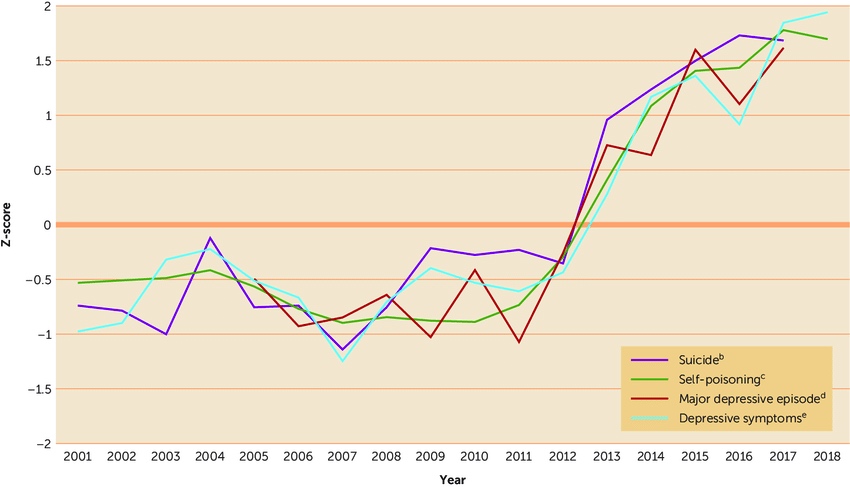 L’incremento dei casi di depressione, autolesionismo e suicidio tra le adolescenti statunitensi tra il 2012 e il 2018 (Jean M. Twenge, 2020)