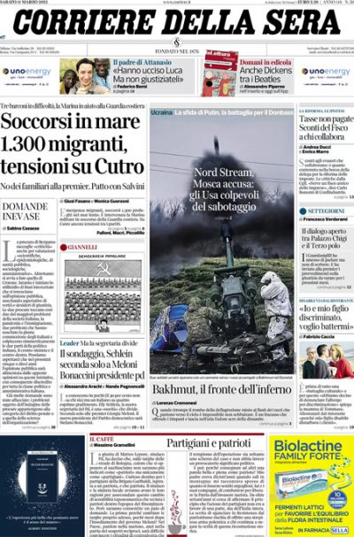 La maggior parte dei giornali di oggi si occupa in apertura del salvataggio da parte della Guardia costiera e della Marina militare di alcune imbarcazioni di migranti in difficoltà al largo delle coste della Calabria con oltre 1.300 persone a bordo e della manifestazione di oggi a Cutro per protestare contro le morti nel Mediterraneo. Repubblica e il Sole 24 Ore titolano invece sul fallimento della Silicon Valley Bank negli Stati Uniti, il Messaggero apre su nuovi aiuti economici per ridurre le tariffe energetiche, il Giornale apre sulle indagini della magistratura sul Movimento 5 Stelle, il Secolo XIX e il Resto del Carlino si occupano della sentenza del Consiglio di Stato contro la proroga delle concessioni balneari, Libero se la prende con la pallavolista Paola Egonu per la scelta di tornare a giocare a Milano dopo le sue parole sul razzismo in Italia, e la Verità e il Fatto affrontano due loro grandi classici: il primo le critiche alle misure per il contrasto della pandemia, il secondo i rapporti con la giustizia di Silvio Berlusconi e Matteo Renzi. I giornali sportivi commentano la sconfitta dell’Inter con lo Spezia nell’anticipo della giornata di Serie A.