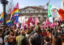 Nel pomeriggio di sabato a Milano si è tenuta una manifestazione contro una richiesta del ministero dell’Interno a tutti i sindaci italiani di smettere di trascrivere i certificati di nascita dei bambini con due padri o con due madri.