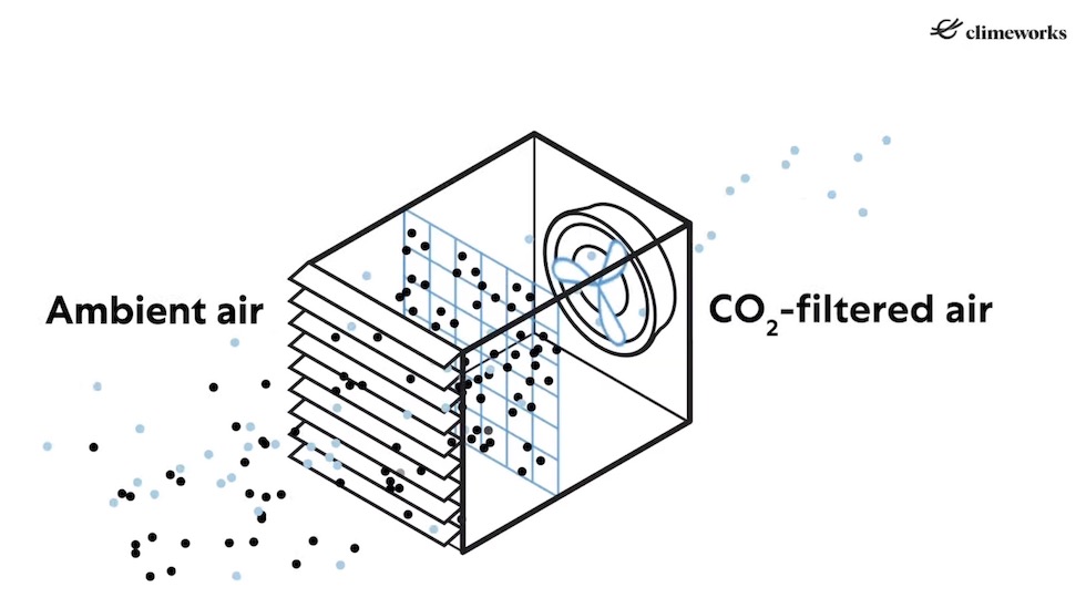 Almeno concettualmente, il sistema di cattura della CO2 non è complicato ed è alquanto lineare. Alcune grandi ventole aspirano l’aria e la fanno passare attraverso un filtro altamente poroso al quale si legano le molecole di anidride carbonica. In un certo senso il filtro si comporta come una spugna quando viene in contatto con l’acqua: la intrappola e la trattiene.