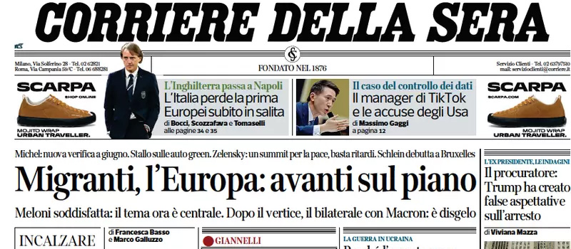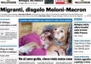 La maggior parte dei giornali di oggi si occupa della riunione del Consiglio europeo di ieri a Bruxelles e dell’incontro che si è tenuto a margine fra la presidente del Consiglio Meloni e il presidente francese Macron, in cui l’Italia ha cercato di rendere centrale il tema delle politiche sull’accoglienza dei migranti. Altri giornali titolano invece sulla decisione del Partito Democratico di ritirare il disegno di legge che voleva evitare che madri e bambini fossero detenuti in carcere, dopo che gli emendamenti presentati dalla maggioranza ne avevano stravolto il senso, il Manifesto segue le manifestazioni di protesta in Francia contro la riforma delle pensioni, la Verità difende la gestione del governo della strage di Cutro, e Domani si occupa del processo per le violenze nel carcere di Santa Maria Capua Vetere. I giornali sportivi commentano la sconfitta dell’Italia con l’Inghilterra nella prima partita delle qualificazioni agli Europei dell’anno prossimo.