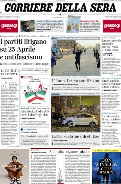 Nelle prime pagine di oggi trova molto spazio la questione dei festeggiamenti del prossimo 25 aprile, giorno in cui in Italia si celebra la Festa della liberazione dal nazifascismo. Di cosa avrebbe fatto il governo di destra in questa occasione era una questione emersa già all’inizio della legislatura, lo scorso settembre, e in questi giorni è diventato argomento di polemica politica, soprattutto ora che si sa che il presidente del Senato, Ignazio La Russa, andrà in visita in Repubblica Ceca. I giornali che non aprono sul 25 aprile si occupano di questioni economico-finanziarie o dei ritardi del PNRR, il piano nazionale di ripresa e resilienza.