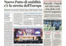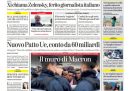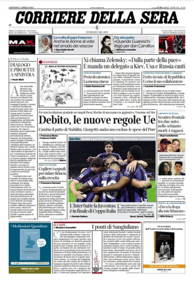 Le notizie principali in apertura sui giornali di oggi sono due: la guerra in Ucraina, con il colloquio telefonico di ieri fra il presidente ucraino Zelensky e quello cinese Xi Jinping e l’attacco a Kherson contro un giornalista di Repubblica che è stato ferito e uno ucraino che è stato ucciso, e la proposta presentata ieri dalla Commissione Europea per riformare il Patto di stabilità, l’accordo per tenere sotto controllo i conti pubblici dei paesi dell’Unione Europea. Domani apre invece sull’informativa al parlamento del ministro Fitto sui ritardi del PNRR, mentre i giornali sportivi commentano la vittoria in semifinale di Coppa Italia dell’Inter, che si qualifica per la finale, sulla Juventus.