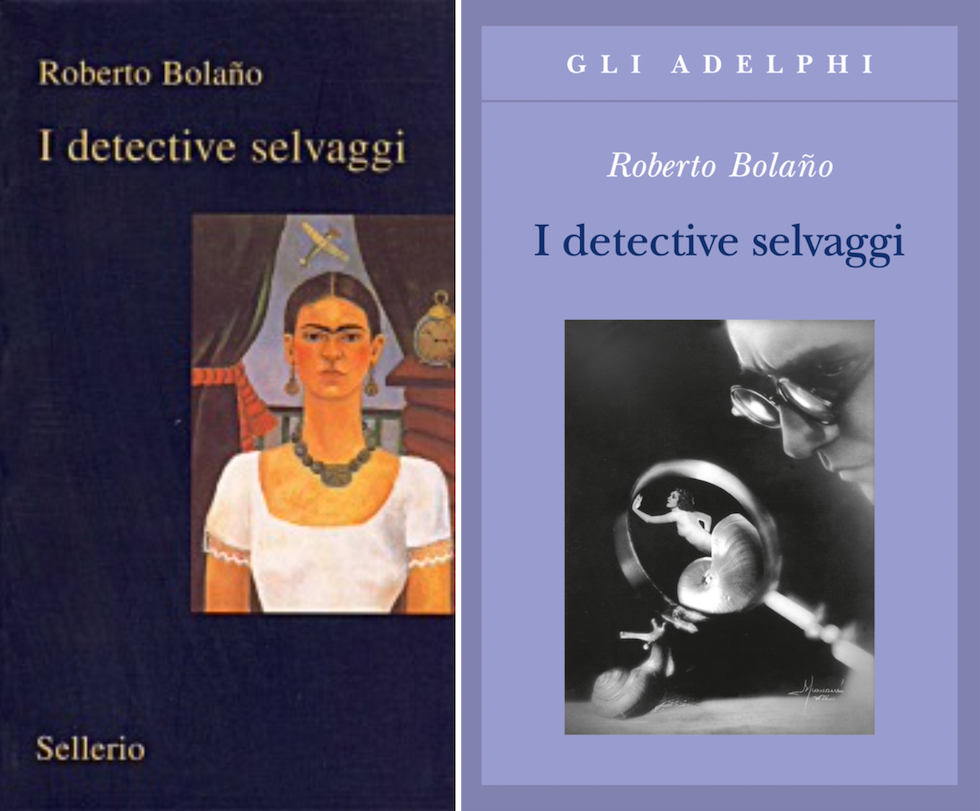 A sinistra la copertina della prima edizione italiana di “I detective selvaggi”, pubblicata da Sellerio, a destra quella dell’edizione tascabile Adelphi attualmente in libreria