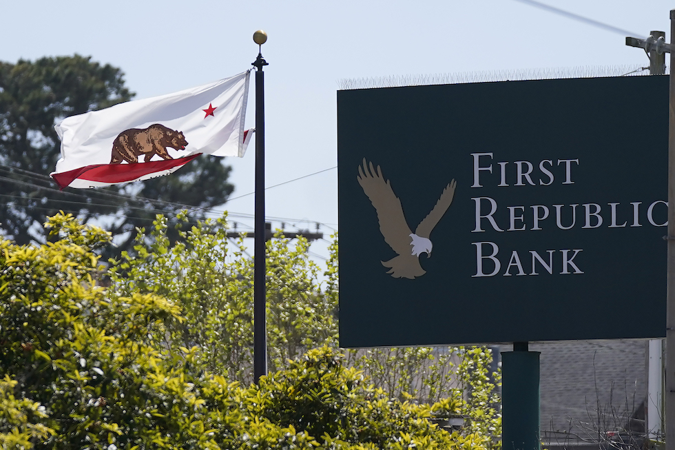 Un’insegna della First Republic Bank e una bandiera californiana a San Francisco (AP Photo/Jeff Chiu)