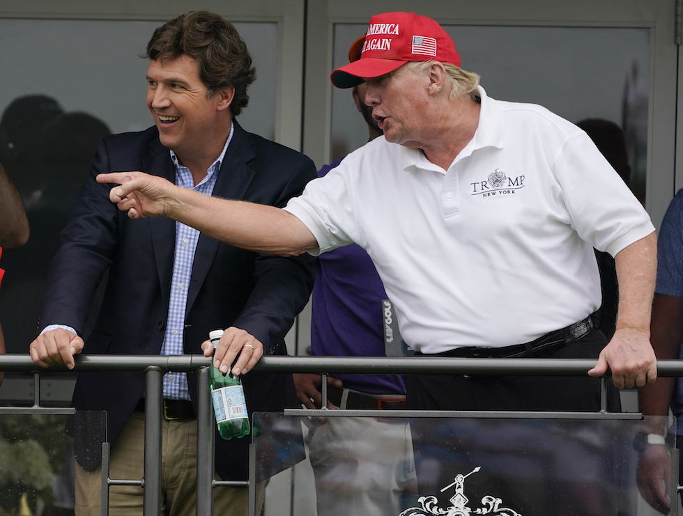 Tucker Carlson con l’ex presidente Donald Trump a un torneo di golf (AP Photo/Seth Wenig)