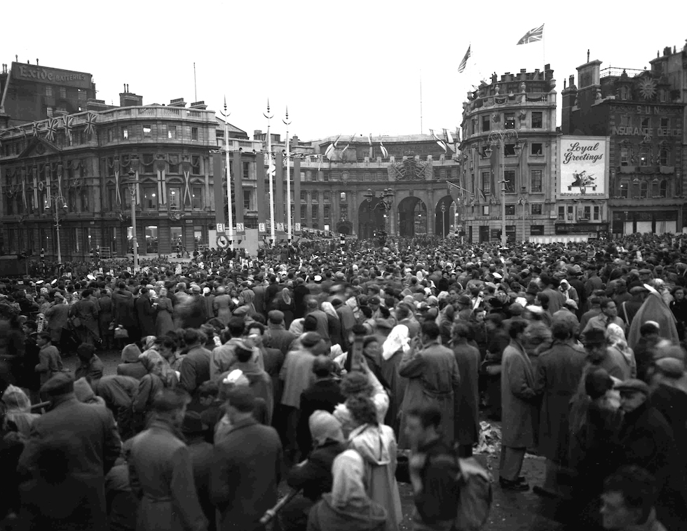 La folla radunata a Trafalgar Square per vedere la processione dopo l’incoronazione di Elisabetta II (AP Photo)