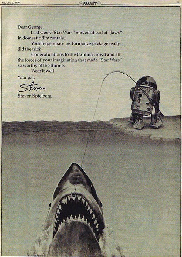 Il film Lo Squalo, diretto da Steven Spielberg e uscito il 20 giugno 1975, divenne in breve tempo il film con il maggiore incasso di sempre e lo rimase per due anni finché non uscì Star Wars, nel 1977. Per congratularsi con George Lucas, autore e regista di Star Wars, Spielberg scrisse una breve lettera pubblicata il 2 dicembre 1977 sulla famosa rivista di cinema Variety. Insieme al testo della lettera c’era un disegno a tutta pagina che mostrava il personaggio di Star Wars R2-D2 pescare lo squalo della locandina del film di Spielberg.