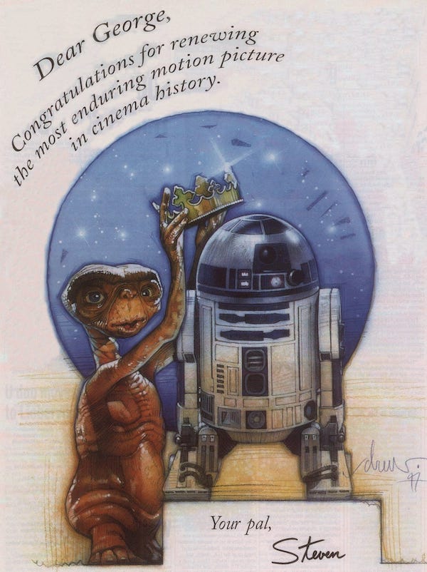 Nel 1997 Spielberg rivolse ancora una volta le congratulazioni a Lucas, in occasione dell’uscita nei cinema dell’edizione speciale della trilogia di Star Wars: «Caro George, congratulazioni per aver rinnovato il film più longevo nella storia del cinema».
