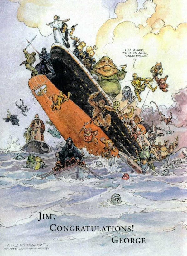 Quando Titanic, un anno dopo, superò Star Wars e divenne il film con i maggiori incassi di sempre, Lucas si congratulò con Cameron facendo pubblicare su Variety un breve messaggio e un’illustrazione dell’artista statunitense Iain McCaig, in cui i personaggi della saga di Lucas si gettano nell’oceano saltando dal Titanic.