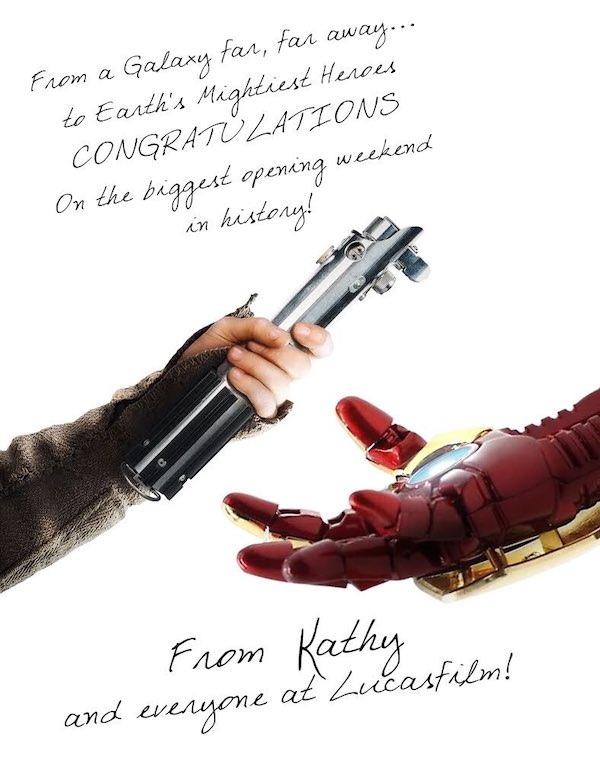 Nel 2018 Star Wars fu superato a sua volta da Avengers: Infinity War per incassi nel primo weekend di programmazione. La Lucasfilm, la casa di produzione di Star Wars, presieduta dall’amica e collega di Lucas Kathleen Kennedy, si congratulò con i produttori di Avengers: Infinity War pubblicando su Twitter un’illustrazione con un passaggio di testimone (in questo caso una spada laser) tra la protagonista del nuovo Star Wars Rey e Iron Man. «Da una galassia lontana lontana… ai più potenti eroi della terra, congratulazioni per il miglior weekend d’apertura nella storia».