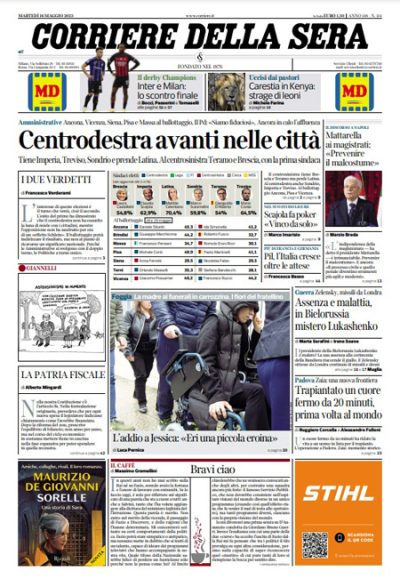 Le elezioni amministrative svoltesi in diverse città italiane fra domenica e lunedì sono la notizia di apertura su quasi tutti i giornali di oggi, che sottolineano il buon risultato della destra ma anche un risultato superiore alle previsioni del centrosinistra in alcune città. Il Giornale, Libero e la Verità si occupano invece dell’abbandono della RAI da parte di Fabio Fazio e Luciana Littizzetto, il Manifesto si occupa delle elezioni presidenziali in Turchia che andranno al ballottaggio con un risultato superiore alle attese per il presidente uscente Erdogan al primo turno, e Avvenire titola sui tentativi diplomatici per fermare la guerra fra Russia e Ucraina. I giornali sportivi presentano la semifinale di ritorno di Champions League di stasera fra Inter e Milan.