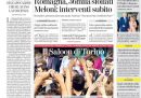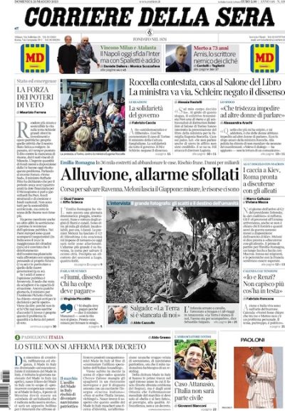 Lo spazio più ampio sulle pagine dei giornali è occupato anche oggi dalle notizie sull’alluvione in Emilia-Romagna: alcuni si concentrano sul fatto che oggi la presidente del Consiglio, Giorgia Meloni, andrà in visita nelle zone più colpite, altri sulla conta dei danni e delle persone sfollate (36mila). In una piccola parte di molte prime pagine c’è anche spazio per il G7, a cui ieri ha partecipato anche il presidente ucraino, Volodymyr Zelensky, e per la piccola contestazione che c’è stata ieri al Salone del Libro di Torino nei confronti della ministra per la Famiglia, Eugenia Roccella.