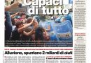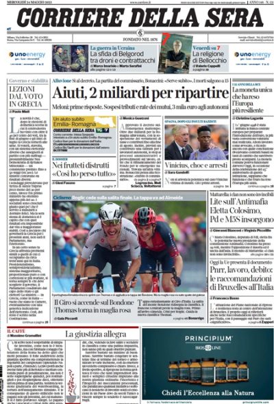 Ci sono notizie diverse in apertura sui giornali di oggi: molti titolano sul decreto-legge approvato ieri dal Consiglio dei ministri con cui sono stati stanziati due miliardi di euro di aiuti per le zone colpite dall’alluvione in Emilia-Romagna, altri si occupano dell’anniversario della morte di Giovanni Falcone e degli scontri con la polizia alla manifestazione di studenti e associazioni antimafia a Palermo, altri ancora aprono sull’elezione della deputata di Fratelli d’Italia Chiara Colosimo a presidente della commissione parlamentare antimafia, contestata dall’opposizione. Libero titola sul reddito di cittadinanza, la Verità critica il presidente della Repubblica Mattarella, considerato il “capo dell’opposizione” al governo, e i giornali sportivi presentano la finale di Coppa Italia di stasera fra Fiorentina e Inter e si occupano della situazione della Juventus dopo la penalizzazione per il caso delle plusvalenze.